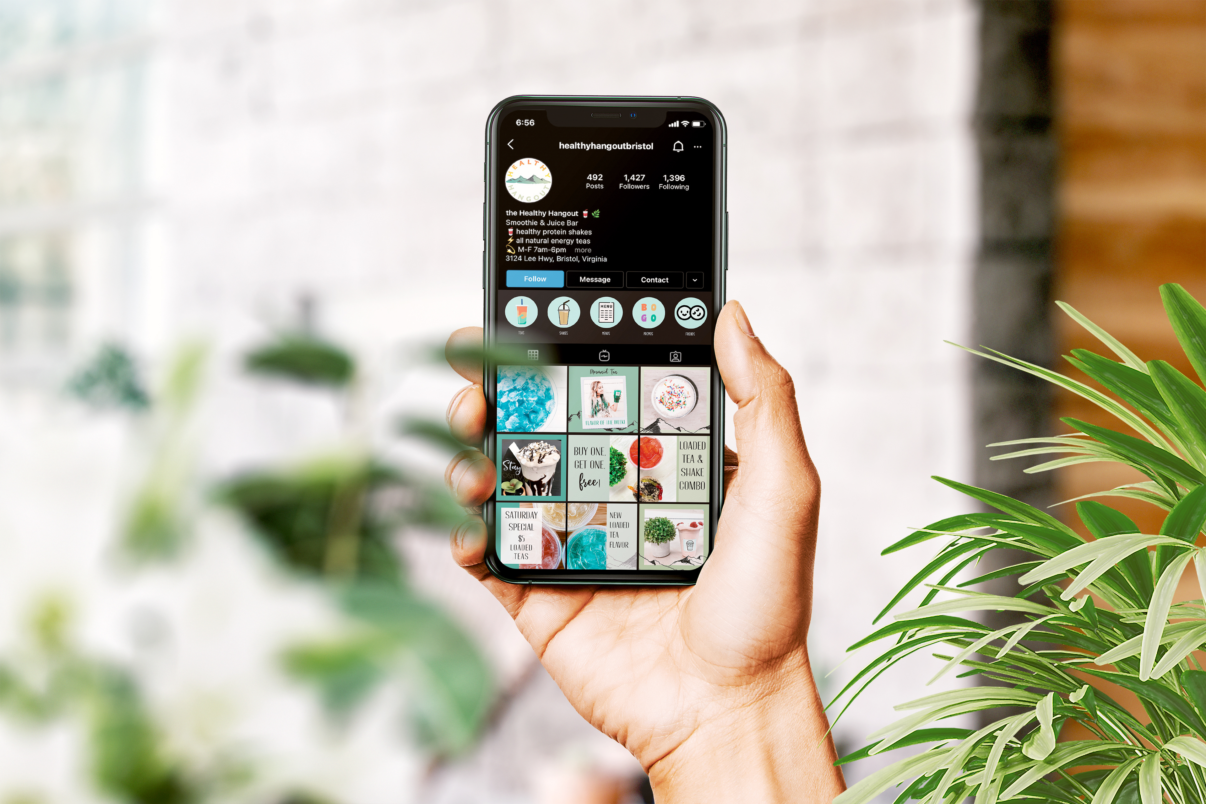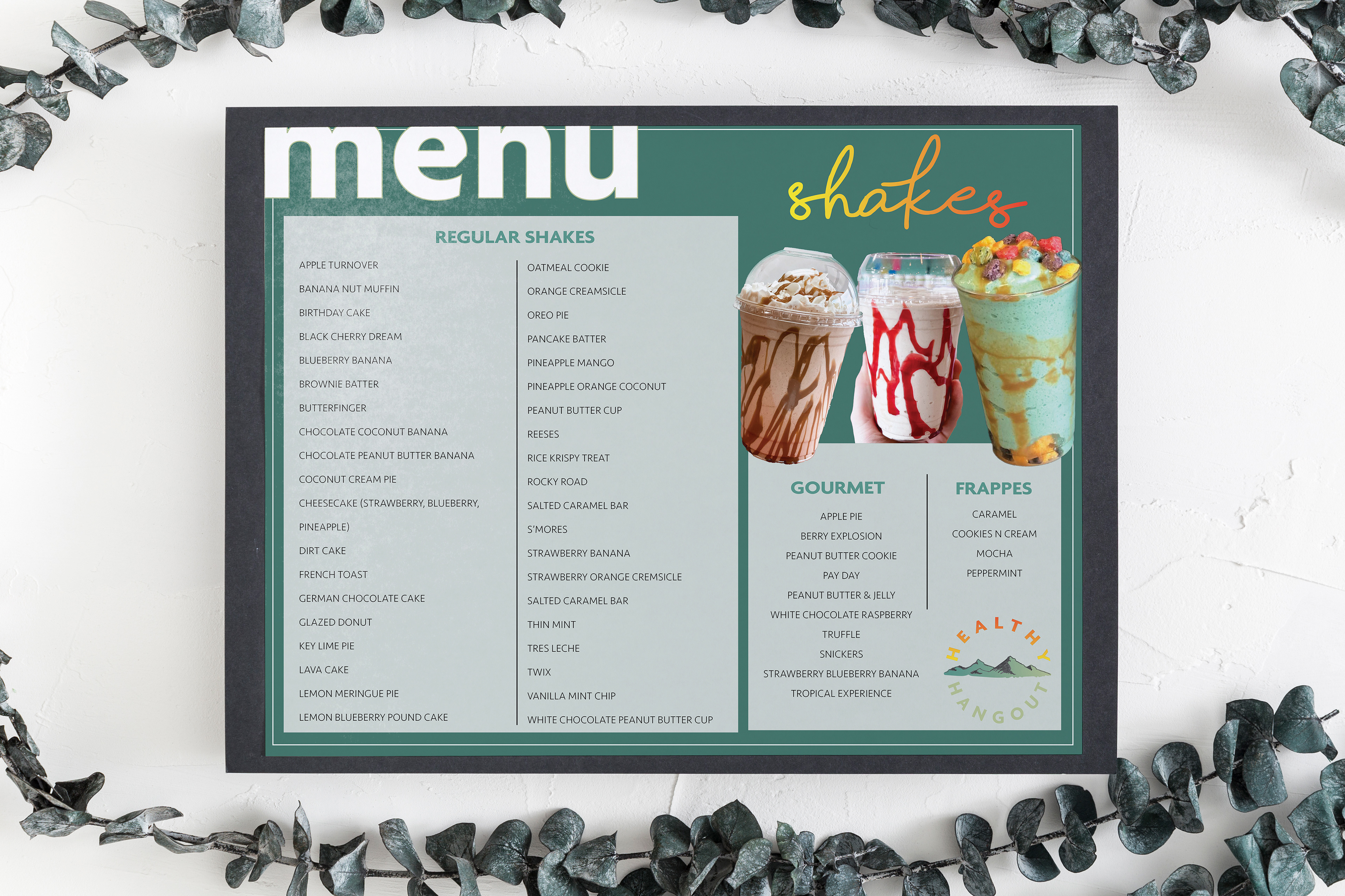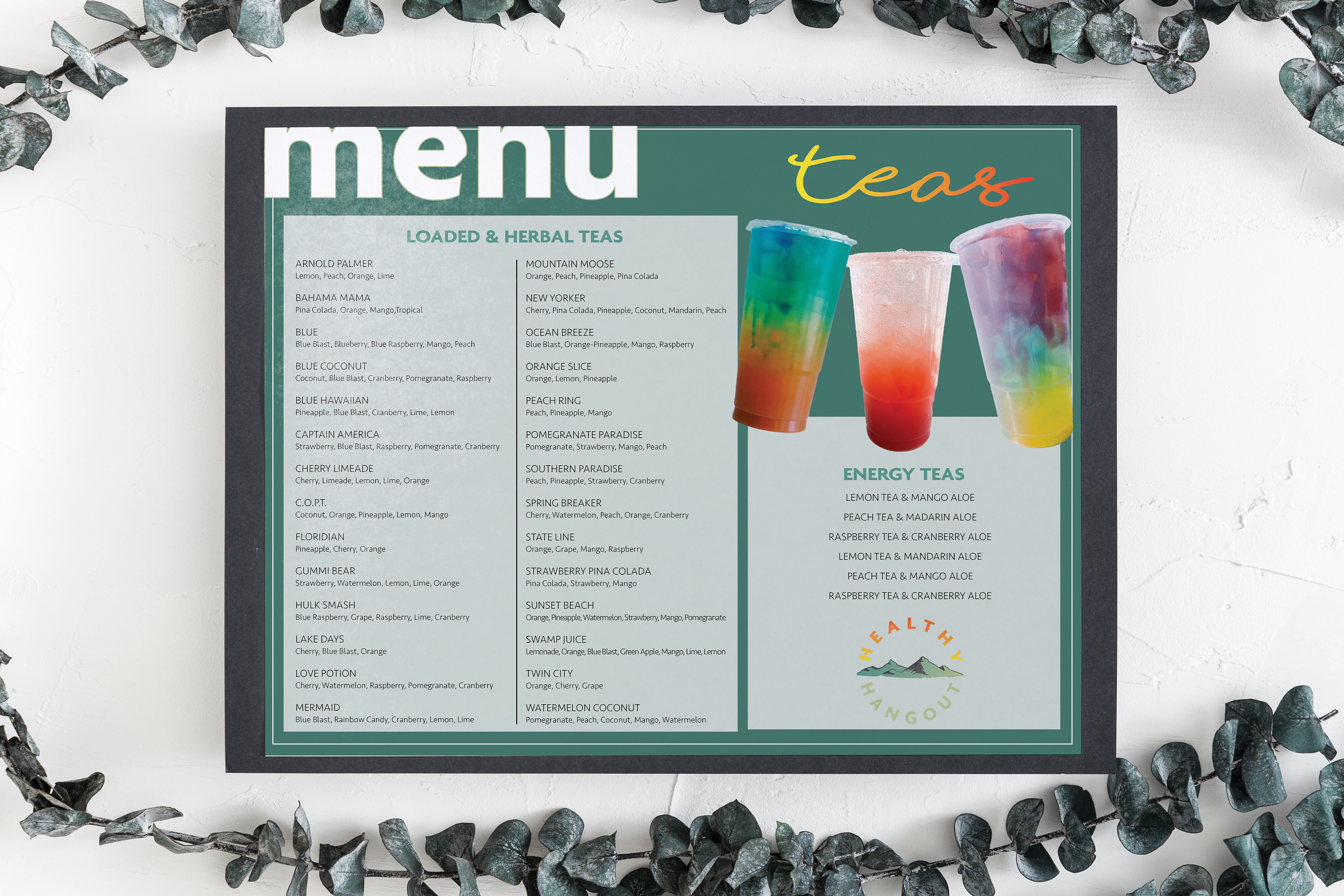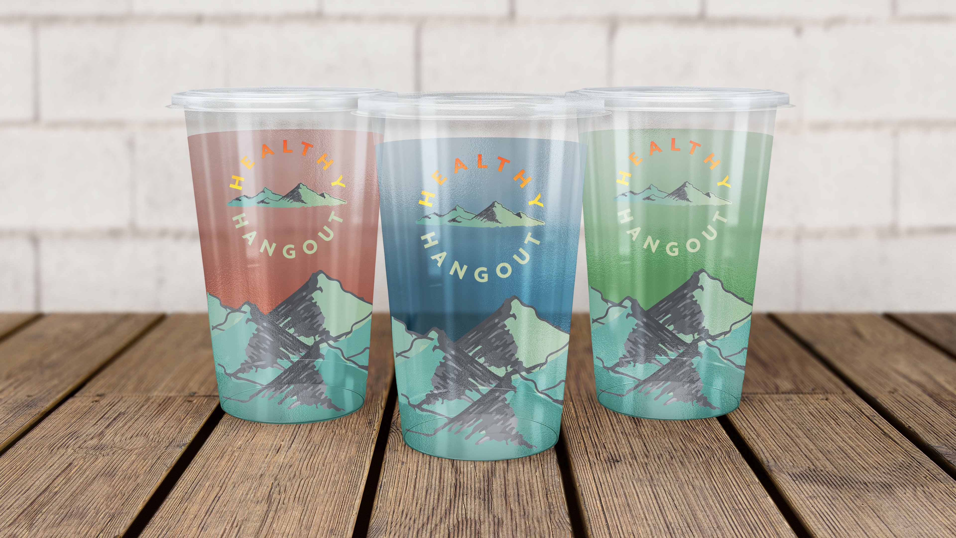 The Healthy Hangout is a functional beverage bar that serves teas and shakes made with Herbalife products. The store is located in Bristol, Tennessee which is famous for the Appalachian Mountains and the Virginia/Tennessee border. The Healthy Hangout logo is inspired by its location and the popular loaded teas with the colorful gradient of flavors. The integrated brand identity consists of the logo, beverage cups, menus, and an Instagram profile. The natural mountain greens and blues combined with the tea inspired yellow, orange, and red color scheme provides a welcoming feeling. Customers feel intrigued to begin their journey to a healthier lifestyle and are compelled to come back.